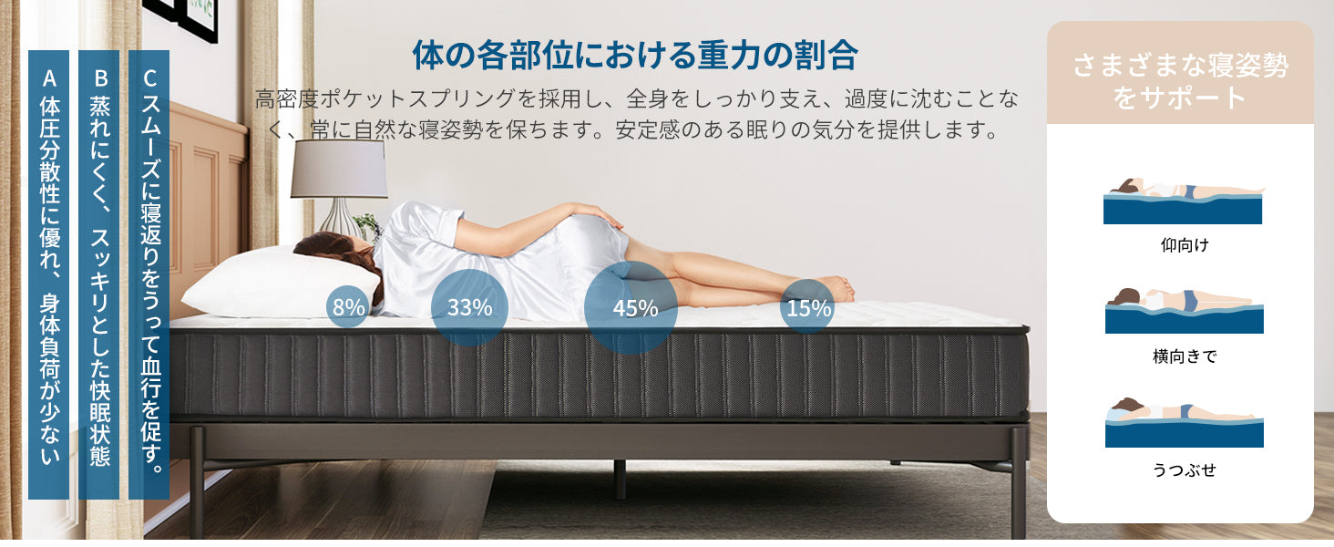 - 【体の各部位における重力の割合】高密度ポケットスプリングを採用し、全身をしっかり支え、過度に沈むことなく、常に自然な寝姿勢を保ちます。体圧分散性に優れ、身体負荷が少なく、蒸れにくく、スッキリとした快眠状態を実現します。また、スムーズに寝返りをうって血行を促進します。