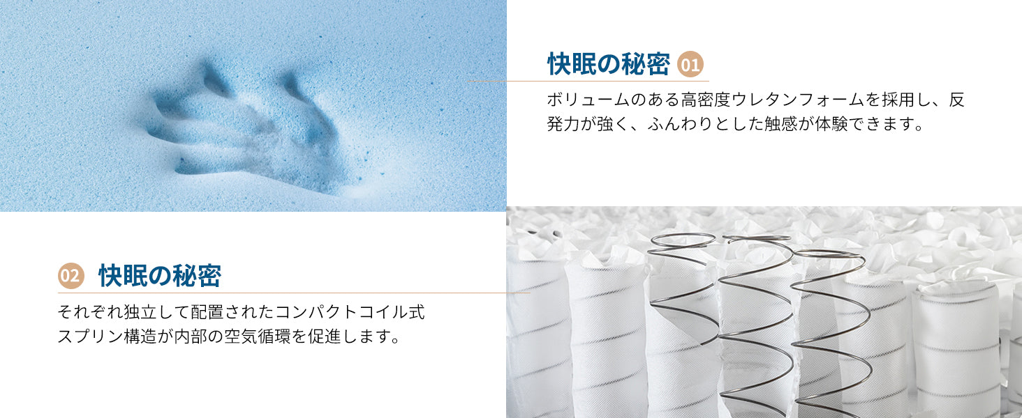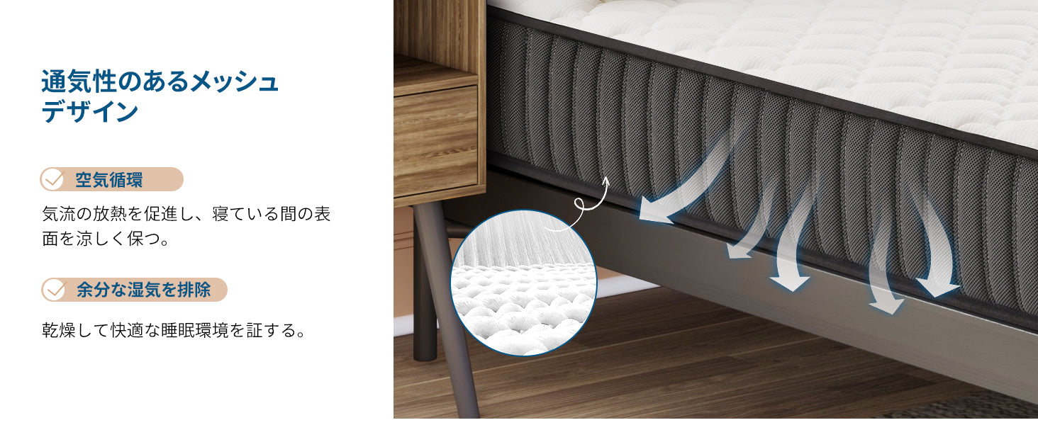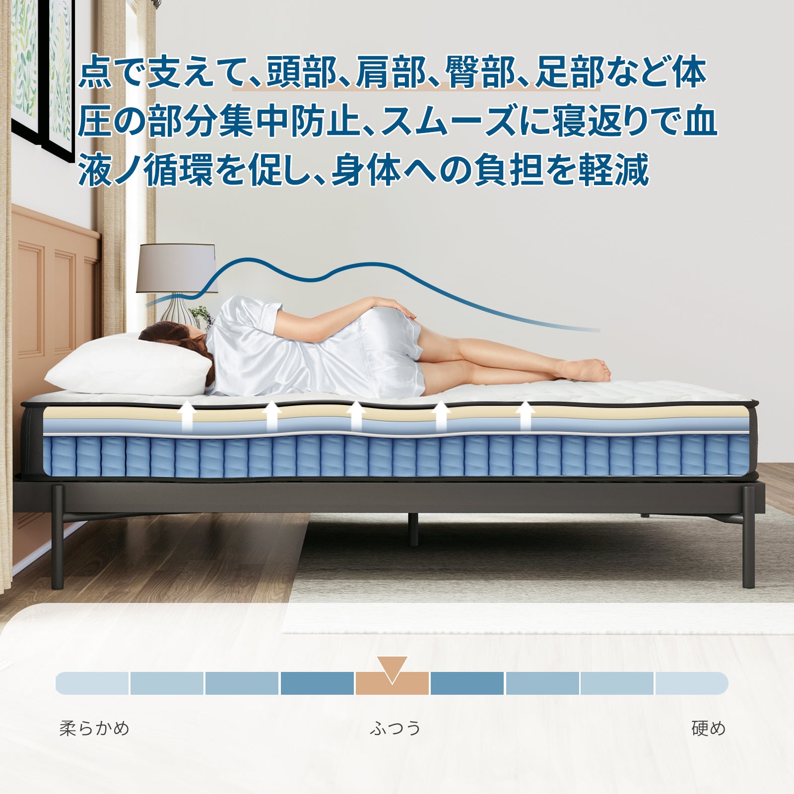 - 【ポケットコイル構造】コイルスプリングを小さな袋にひとつずつ入れたものをマットレス全体に敷き詰め、寝返りの際に横揺れしにくく安定した構造です。それぞれ独立しているコイルは隣の人の寝返りや動きなどの振動を抑え、隣の人の睡眠を妨げず、就寝や起床時間の違いなどのストレスも軽減できます。ベッドマットレスは静かな睡眠環境を作り、浅い眠りの人に向いています。
