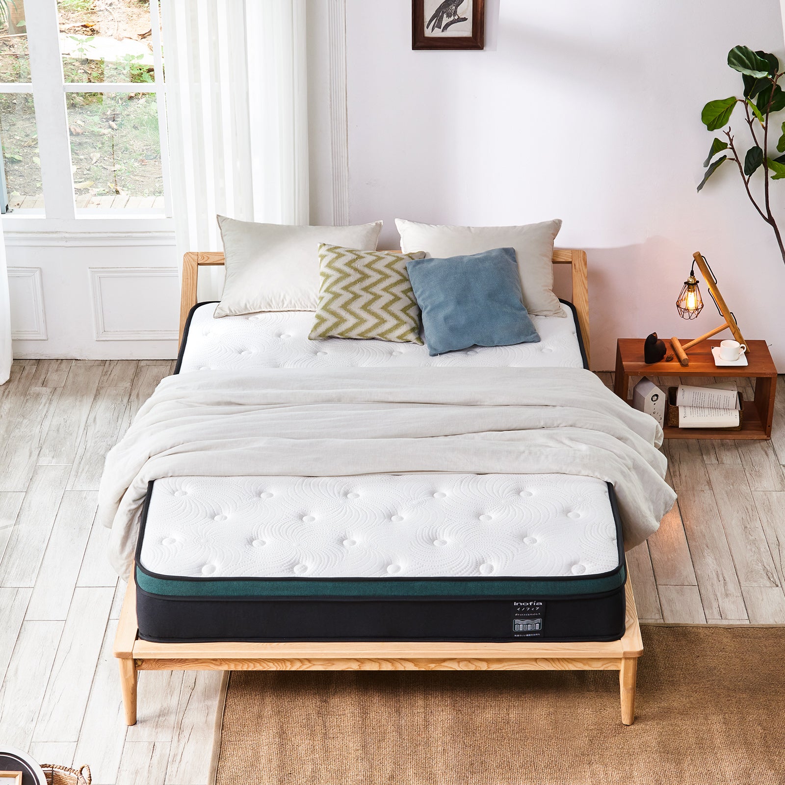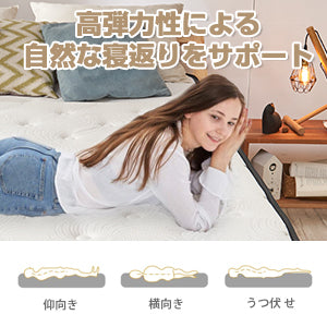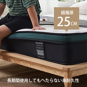厚さ25cm、理想のな寝心地へ:「Inofia」マットレスの厚さが25cmで、上質な素材を選び、柔らかく、通気性が良く、サラッとした肌触りです。さらに、独立したポケットコイルスプリングが身体をしっかり支えています。「純」高反発マットレスがしっかり支えて腰にリラックスしてくれます。生地のツッパリ感をおさえ包み込む様な優しい寝心地を実現しております。