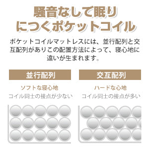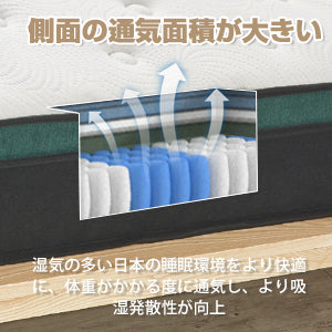 高反発連続ポケットコイル:線径2.0mm / 2.2mm二つ種類線径、それぞれの独立したポケットコイルは不織布の袋で袋に入れて并べ、耐久性に大変すぐれています。日本人の体格、環境を考慮してできます。マットレスにはさまざまな体重の人を運ぶことができ、横への振動が伝わりにくいのが特徴なので、隣で寝ている人を起こしてしまう事もありません。安定感のある寝心地を味わえます。